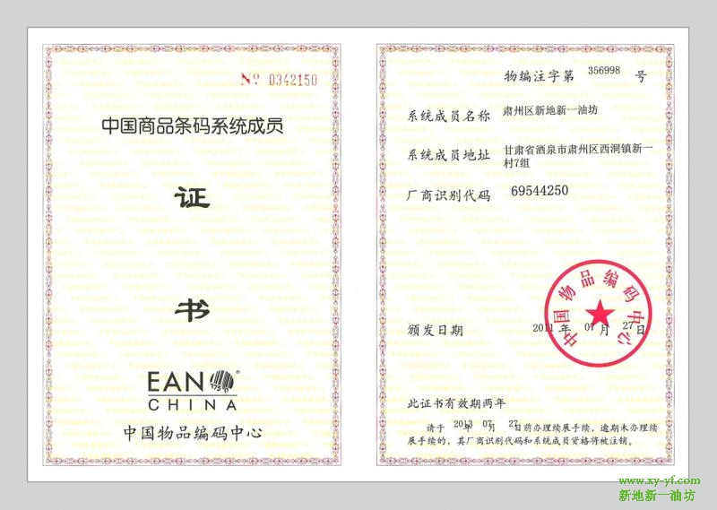 详细介绍:中国商品条码系统成员证书