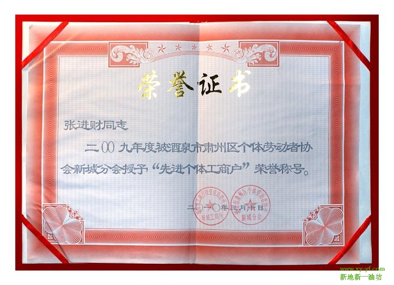 详细介绍:先进个体工商户荣誉证书